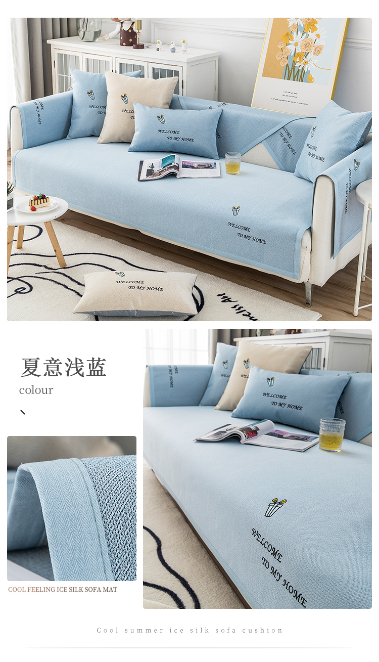 今后夏季冰丝ソファーマット现代简约刺繍夏款客间防滑凉席ソファカバー夏意浅蓝70*210 cm【图片价格品牌报价】-